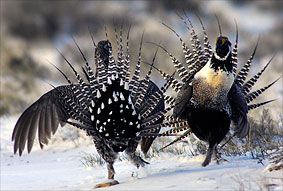 Leks是鳥(niǎo)的驚人的求偶顯示的舞臺(tái)。黎明前,松雞在開(kāi)闊的草地上聚集。隨著光線的升起,男性們吹出白色的胸膛,充滿兩個(gè)黃色的氣囊,發(fā)出一個(gè)水汪汪的聲音。他們還炫耀他們的長(zhǎng)脖子羽毛,稱為filoplumes,以打動(dòng)女性松雞。此外,男性們通過(guò)用他們的翼羽拍打他們的對(duì)手為黃金地段打。 (要查看Gunnison Sage-grouse交配儀式的照片和視頻,請(qǐng)?jiān)L問(wèn)www.sanmiguelgrouse.org。)