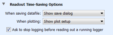 在讀出運行的記錄器之前要求停止記錄。當選中此復選框時,每次讀出仍在記錄數據的記錄器時,都會顯示一條消息。該消息詢問您是要停止記錄器還是讓它在讀取過程中繼續記錄數據。如果取消選擇此復選框,仍在記錄數據的記錄器將在讀出期間自動繼續記錄。