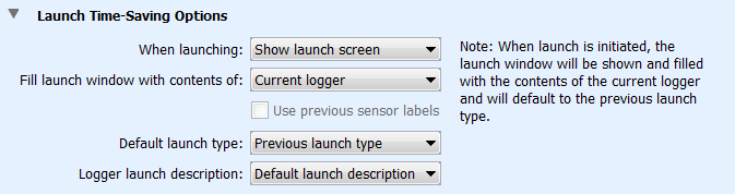 啟動時。從設備菜單中選擇啟動或單擊工具欄上的啟動圖標時,選擇“顯示啟動屏幕”以顯示啟動記錄器窗口,或選擇“自動啟動”以繞過此窗口并使用默認設置啟動記錄器。如果要在不更改任何設置的情況下快速啟動多個記錄器,選擇“自動啟動”特別有用。默認設置由“首選項的內容填充啟動窗口”確定。