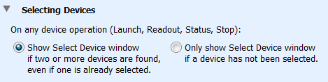 此首選項控制何時顯示“選擇設備”窗口。 如果選擇“顯示選擇設備窗口如果找到兩個或更多設備,即使已經選擇了一個”,則當多個設備連接到計算機時,任何時候顯示選擇設備窗口。 這允許您在任何時間從設備菜單中選擇啟動,讀取,狀態或停止時選擇要使用的設備。 如果選擇“僅顯示選擇設備窗口(如果未選擇設備)”,則選擇設備窗口將僅在您首次選擇啟動,讀取,狀態或停止時顯示。 該設備將保持選中狀態,直到您通過工具欄上的選擇設備圖標進行更改。