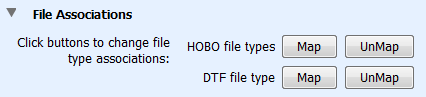 默認情況下,擴展名為.hobo,.hsec和.hproj(HOBO文件)和.dtf和.dsec(DTF文件)的文件將自動與HOBOware相關聯。這意味著這些文件由HOBOware圖標標識,并可以通過雙擊它們打開。單擊Map或UnMap按鈕更改文件類型關聯。