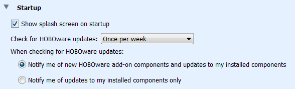 檢查HOBOware更新時。這些設置控制是通知您所有新的軟件更新還是僅影響當前安裝的組件的更新。默認值是檢查任何新的更新。