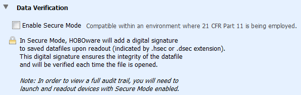 選擇此選項可啟用安全模式,并在讀出記錄器時(對于正在使用21 CFR Part 11的環境),HOBOware Pro會向新數據文件添加數字簽名。 數字簽名由hobo文件的.hsec文件擴展名和dtf文件的.dsec文件擴展名指示。 每次打開數據文件時都會驗證簽名,以確保其完整性。 默認情況下禁用此選項。