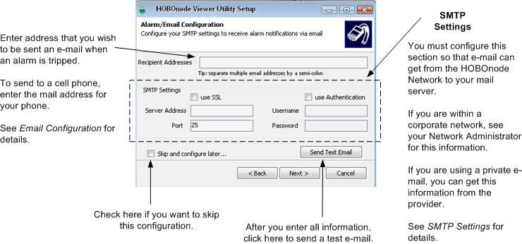 您必須配置SMTP設置以允許郵件從HOBOnode網絡獲取到您的電子郵件帳戶。有關詳情,請參閱SMTP設置。