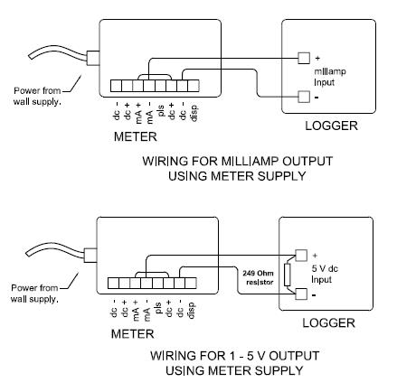 2、下圖顯示了三路將毫安輸出的方法,首先提供一個(gè)隔離的外部供電輸出;第二和第三個(gè)提供電流和電壓輸出,分別由儀表供電。